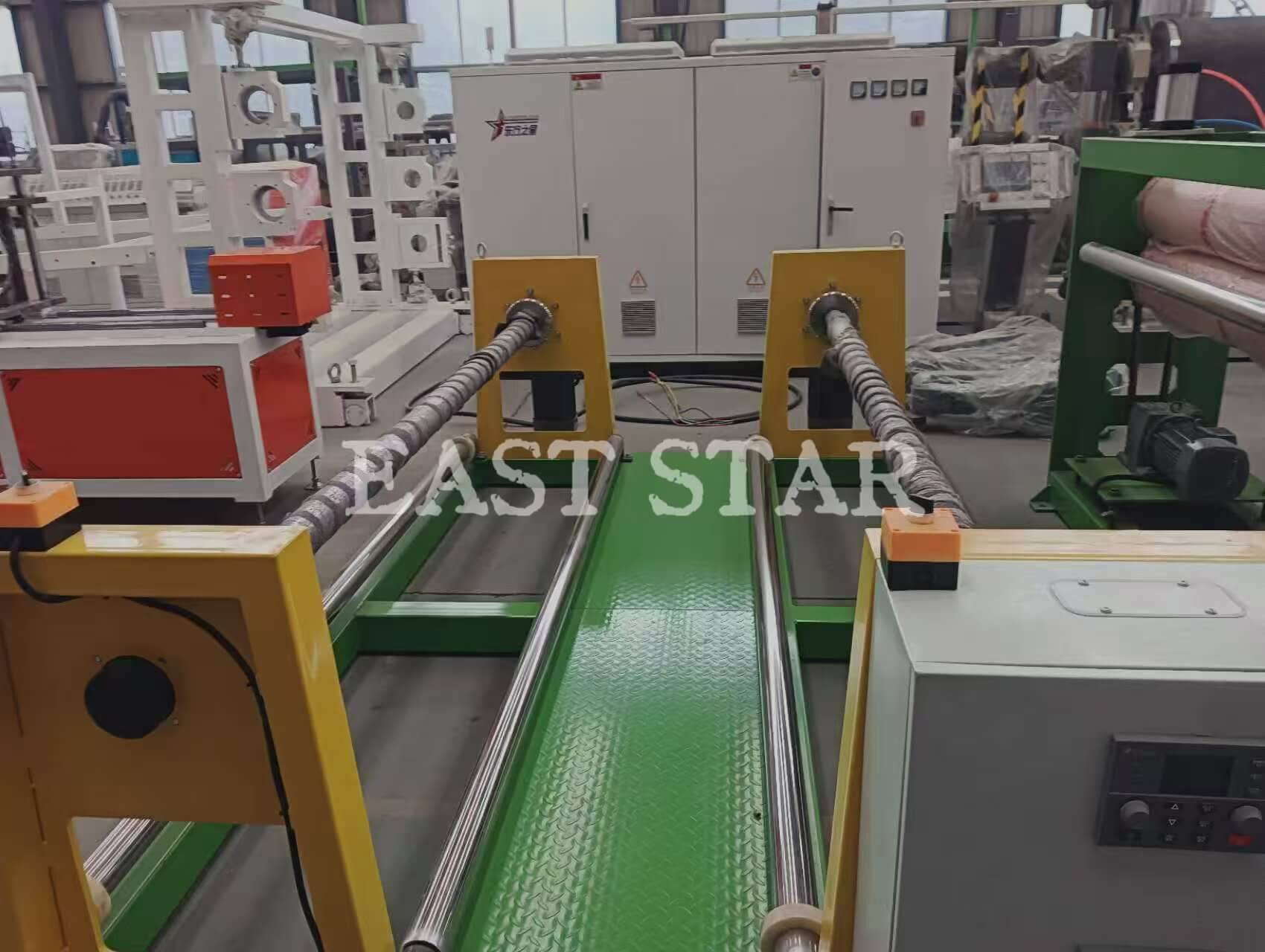 · Trijų ritinių kalendorius: atvėsina ir poliruoja išlydytą ekstruzinį lakštą, tiksliai kontroliuojant galutinio produkto storį ir apdailą.
