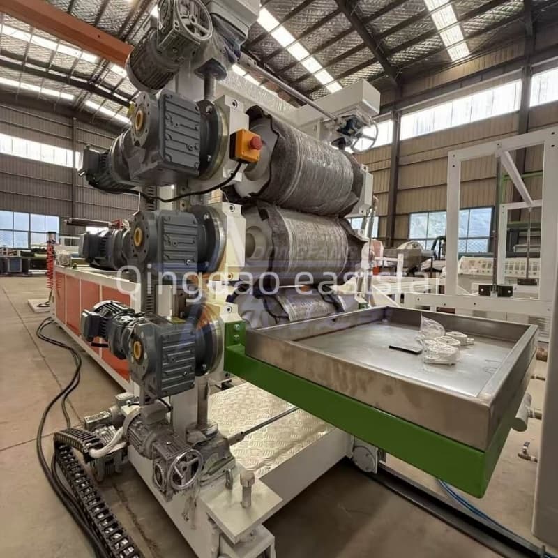 Pagrindinis šio ekstruderisTPU lakštų ekstruzijos įrangaturi TPU būdingą varžtą su mažesniu suspaudimo laipsniu ir gilesniu spiraliniu grioveliu, kuris sumažina šlyties šilumą ir apsaugo nuo medžiagos skilimo. Kartu su kelių zonų statine su tikslia temperatūros kontrole (±1°C) užtikrinamas tolygus ir švelnus TPU žaliavos lydymasis. Nors TPU higroskopiškumas mažesnis nei nailono, jame esanti drėgmė vis tiek gali sukelti mikroburbuliukų susidarymą. Mūsų karšto oro sausinimo džiovintuvai užtikrina nuolat žemą rasos tašką, garantuojantį krištolo skaidrumo lakštų išeigą. Mūsų trijų ritinėlių kalendoriuose yra įrengti nepriklausomi temperatūros valdymo blokai (paprastai reikia kaitinti iki 80–110°C), veidrodinė apdaila ir smulkus poliravimas, užtikrinantis aukštą blizgesį, be įtempių veikimą ir puikų lankstumą. Varomieji guminiai ritinėlių traukos įtaisai neleidžia TPU lakštui išsitempti ar deformuotis, todėl užtikrina pastovią ritinėlio kokybę.