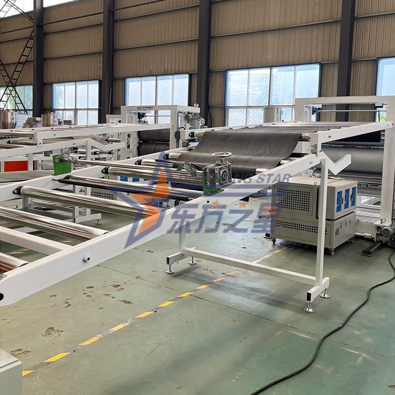 TheTPE neslystančio kilimėlio lakštų gamybos linijaTiksliam darbui naudoja MJ-1160 pakabos tipo veidrodinio apdailos srauto kanalo formą ir SG-1200 trijų ritinėlių kalendorių. Formos srauto kanalas yra chromuotas ir poliruotas, kad būtų užtikrintas vienodas lydalo pasiskirstymas. Kalendoriuje naudojami φ400 mm veidrodinio apdailos volai, kurių paviršiaus šiurkštumas Ra≤0,025 μm. Jis tiksliai reguliuoja ritinėlio temperatūrą per nepriklausomą temperatūros valdymo sistemą.