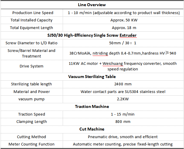 Tikslus formavimas, itin didelis išeiga: 2400 mm ilgio nerūdijančio plieno vakuuminio formavimo stalas, kartu su tikslia vandens temperatūros valdymo sistema, gali greitai ir tolygiai pašalinti šilumą, efektyviai kontroliuoti gaminio aušinimo deformaciją ir užtikrinti itin aukštą gaminio lygumą bei matmenų tikslumą.