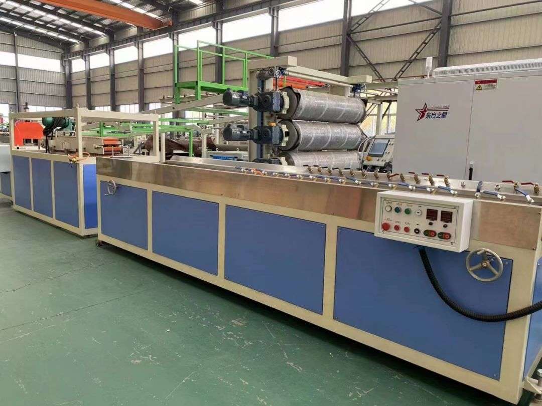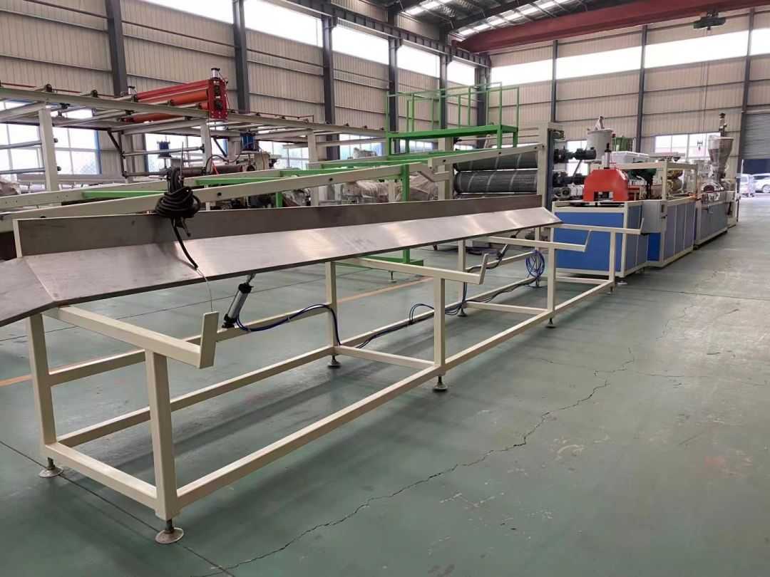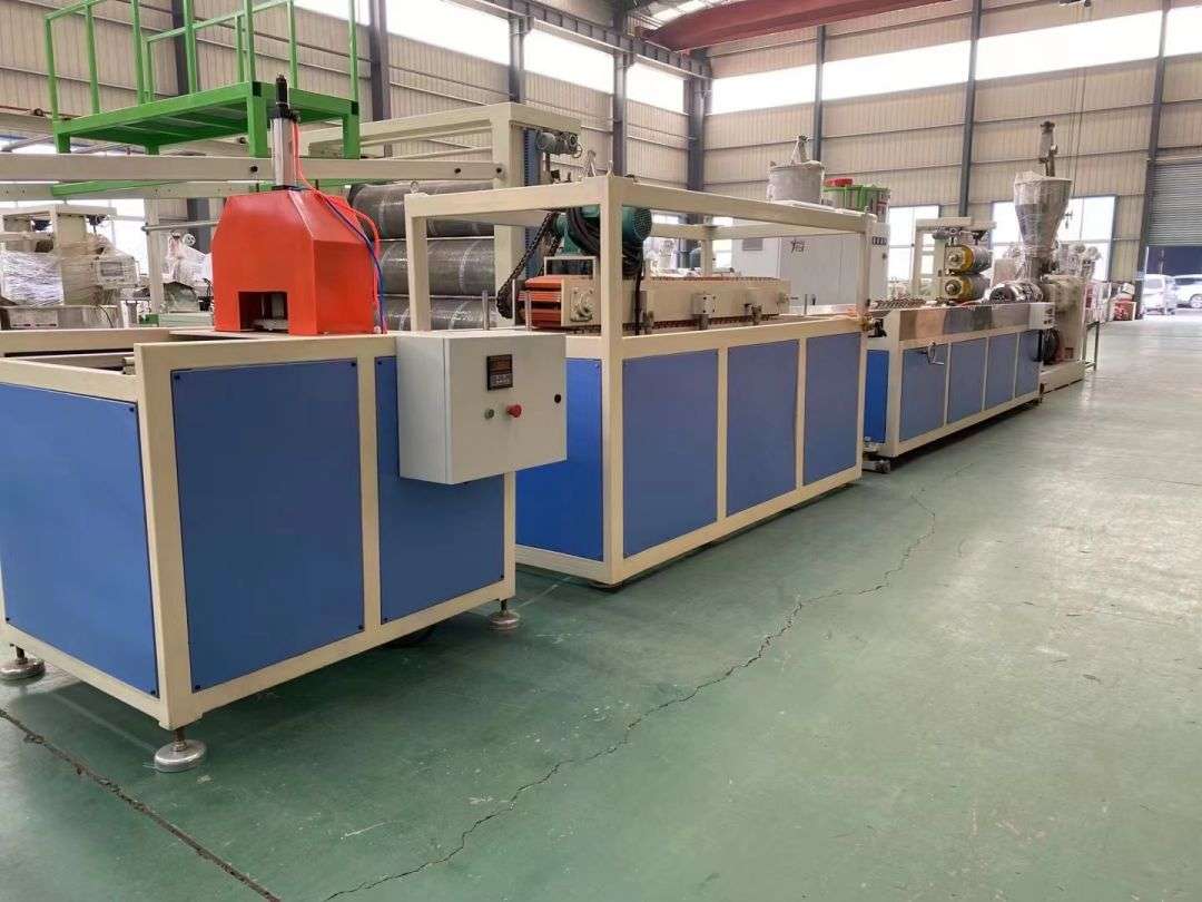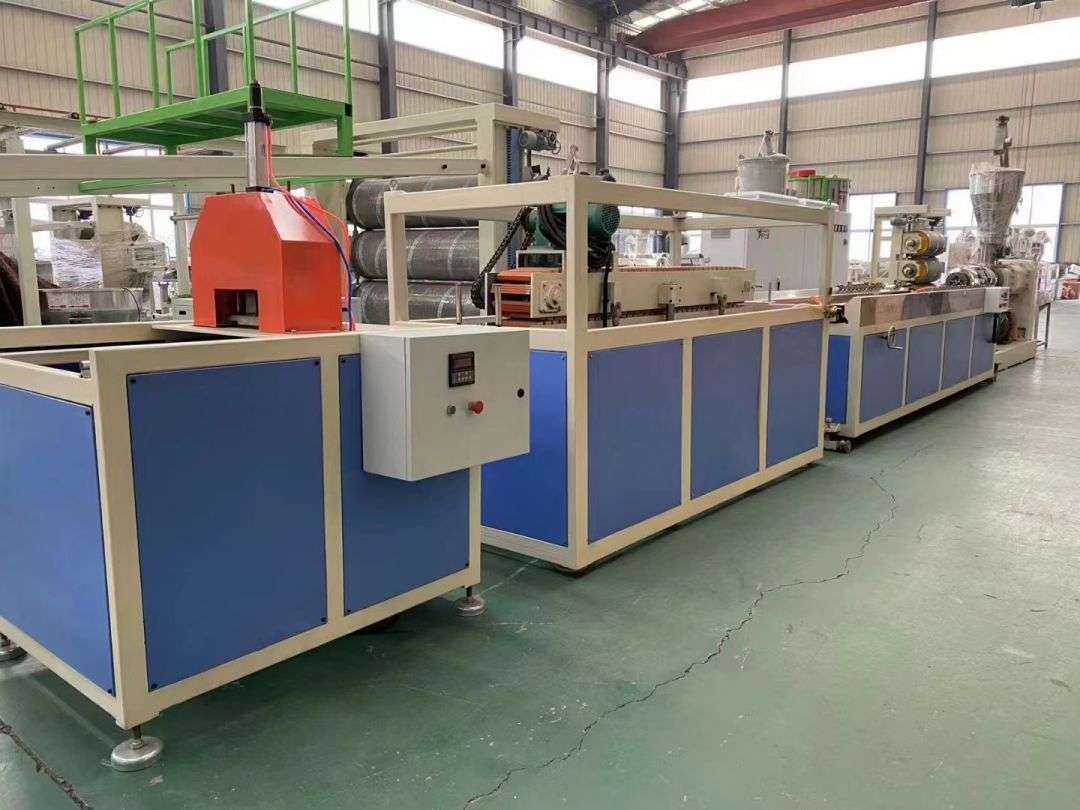 Profilio gamybos linija Profilių gamybos linijoje naudojami SJSZ-65/132 serijos kūginiai dviejų sraigtų ekstruderiai, nerūdijančio plieno vakuuminio formavimo platformos, vikšriniai traktoriai, automatinio pjovimo integruotos mašinos ir apverčiamos iškrovimo stelažai. Formavimo platformoje sumontuotas aukšto slėgio vakuuminis siurblys ir vandens siurblys, kurie yra reguliuojami keturiomis dimensijomis. Traktorius suspaustas pneumatiškai. Automatinė fiksuoto ilgio pjovimo mašina naudoja eigos jungiklį, kad pjaustytų iki fiksuoto ilgio. Krovimo lentyna yra 6 metrų ilgio, pagaminta iš nerūdijančio plieno ir pneumatiškai apverčiama.
