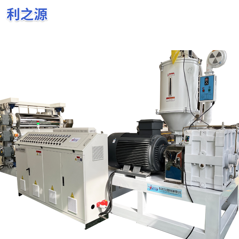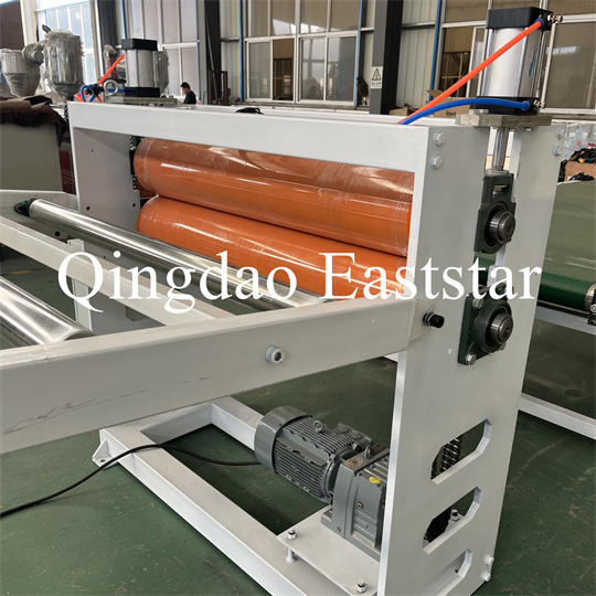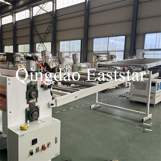 Minkštos PVC neslystančios plokštelės ekstruderio įranga: Įrangą daugiausia sudaro vieno sraigto ekstruderis, trijų ritinėlių kalendorius, 6 metrų aušinimo sistema