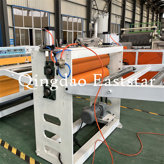 PVC neslystančio kilimėlio įrangos minkštų lakštų mašina: Įrangą daugiausia sudaro vieno sraigto ekstruderis, trijų ritinėlių kalendorius, 6 metrų aušinimas