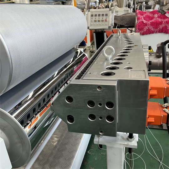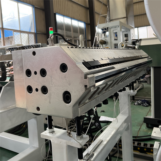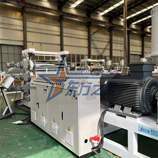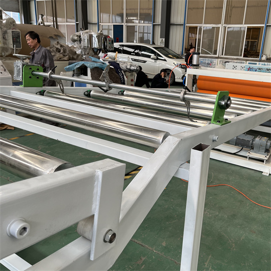 PVC antistatinė plokštės įranga: Įrangą daugiausia sudaro 120 vieno sraigto ekstruderis, trijų ritinėlių kalendorius, aušinimo laikiklis, guminio ritinėlio traukos mašina, kirpimo mašina ir konvejerio juostos įtaisas. Standartinis PVC vėžlio galinės plokštės įrangos gaminio plotis yra 1000 mm. Storis 6 mm. PVC antistatinės ekstruderio plokštės įranga gali pagaminti įvairias tekstūras, tokias kaip vėžlio raštas, apelsino žievelės raštas ir languotas raštas. PVC vėžlių lentos įranga gali būti apdorojama ir pritaikyta pagal kliento reikalavimus.