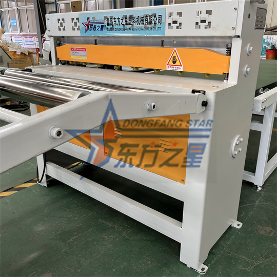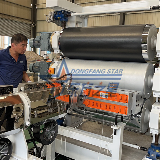 Minkšta PVC antistatinė ekstruderio įranga: Įrangą daugiausia sudaro 120 vieno sraigto ekstruderis, trijų ritinėlių kalendorius, aušinimo laikiklis, guminio ritinėlio traukos mašina, kirpimo mašina ir