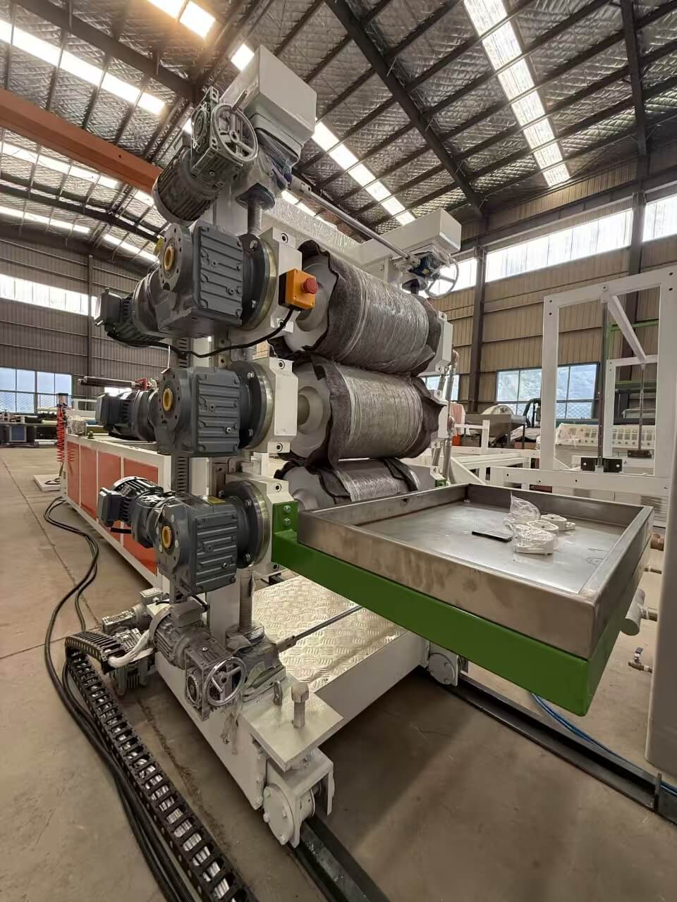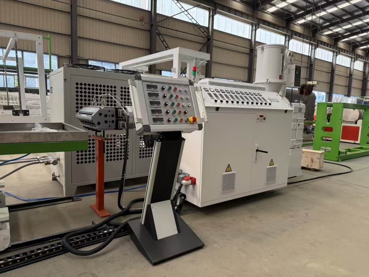 TPU/PE/PP/PS-300 plačialapio ekstruzijos linija skirta granulėms arba susmulkintiems TPU, PE, PP ir PS mišiniams apdoroti. **60–100 kg/h** gamybos pajėgumų linijoje yra komponentų iš pirmaujančių prekių ženklų, tokių kaip Siemens ir Omron. Jame yra 0,8–3 mm lakštinis štampas, trijų ritinėlių kalendorius ir vyniojimo mašina, užtikrinanti aukštos kokybės produkciją. Įranga atitinka griežtus kokybės standartus ir apima išsamią techninę dokumentaciją, kad būtų lengviau valdyti ir prižiūrėti.